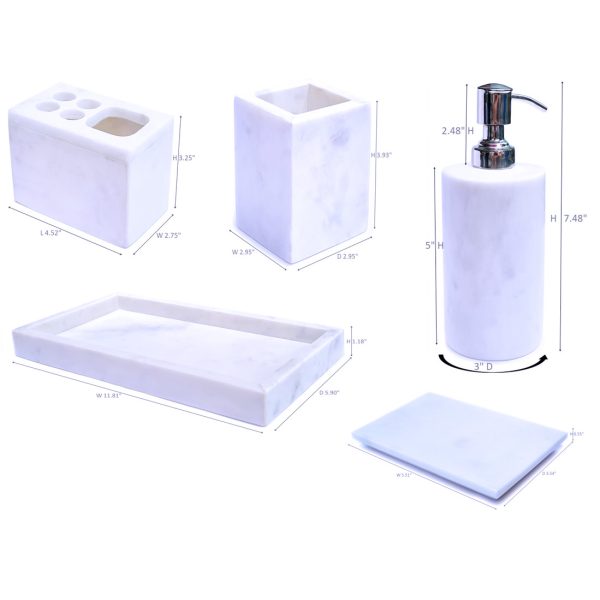 Luxurious Handcrafted Natural White Marble Bath Accessories, Square Set of 5